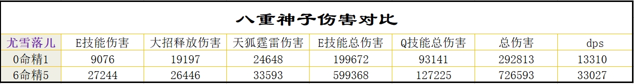 由于八重神子E技能可以连续释放三次,故实战中,被动一般是满层。专武被动满层的情况下,八重神子E技能伤害如图所示,0命9076,2命11345,3命13391,4命14581,6命20830,满命伤害是零命的两倍多。