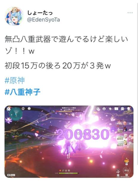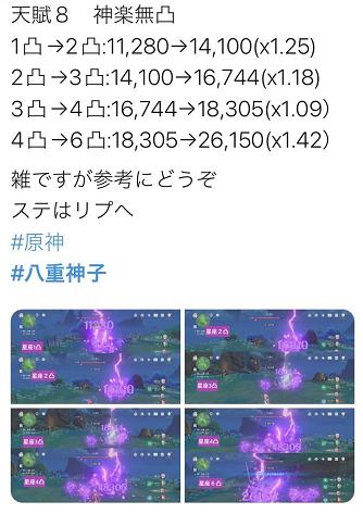 另外也有海外玩家测试了8级e技能在不同命座下的伤害变化,按照1下1w,14秒持续时间14w,这个数据并不高,但需要注意这个是脱手技能,不影响其他主c输出的,同时还能打各种雷有关的反应伤害,2命距离加成下神子的e技能表现优异。