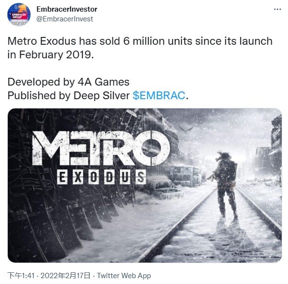 瑞典娱乐、游戏新闻报道者 EmbracerInvest 今日在推特上表示《地铁:离去》全球销量已破600万份。