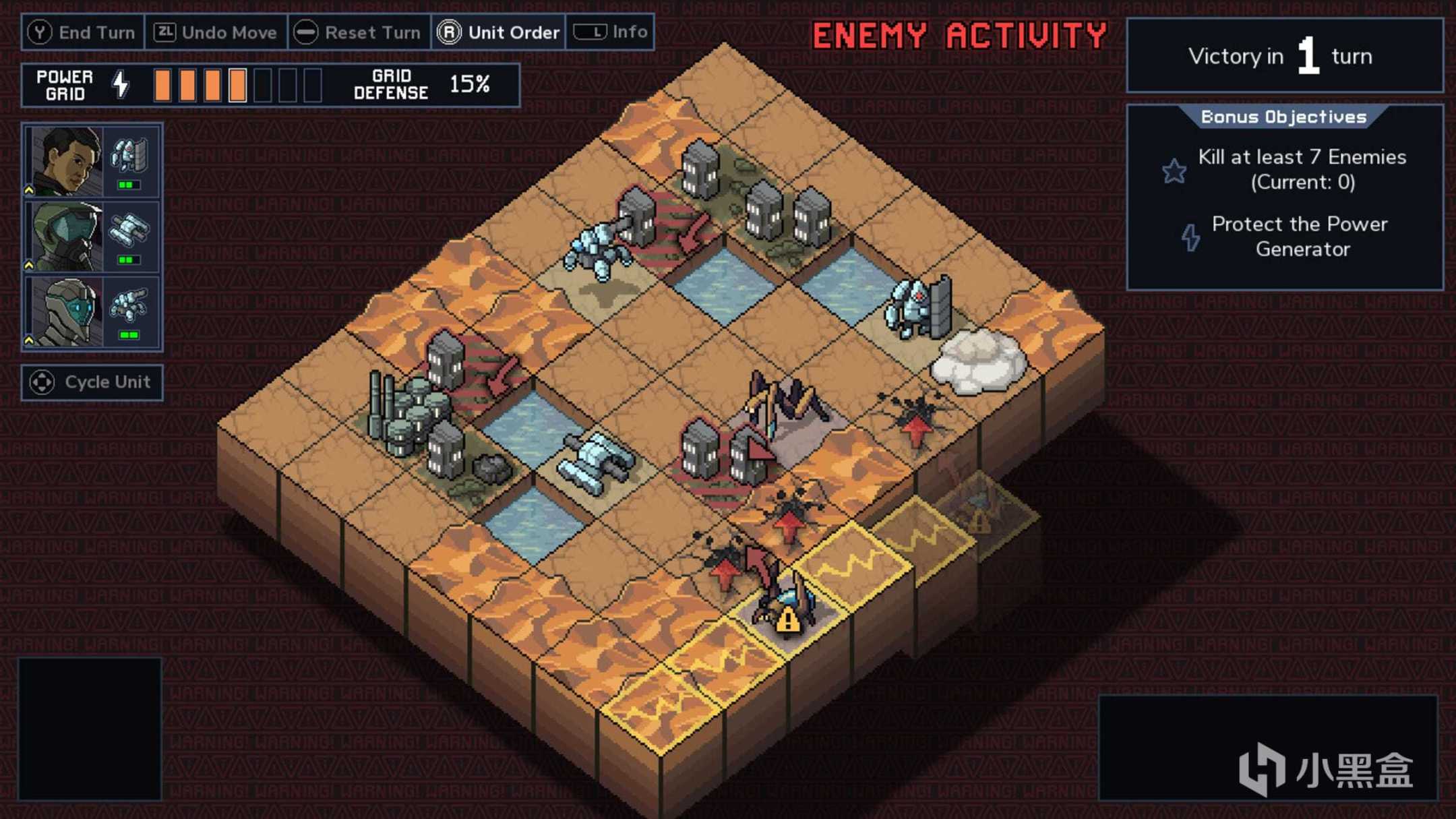 开发者在访谈中指出他们对游戏的整体设计是偏向于防守而不是进攻的,所以这款游戏中有着许多传统战棋所没有的机制。传统战棋中敌人的目标是消灭你的全部棋子,而在这款游戏中你只有固定的三个作战单位,取而代之的是敌人的目标变成了随机散步在8×8棋盘上的人类建筑。当被摧毁的建筑到达一定数量就会使得游戏失败。但是如果撑够5个回合就可以取得战斗的胜利。于是传统战棋的游戏目标——如何消灭所有敌人在这款游戏中就变成了——如何有效干扰敌人的行动,最大化的保护自身利益。