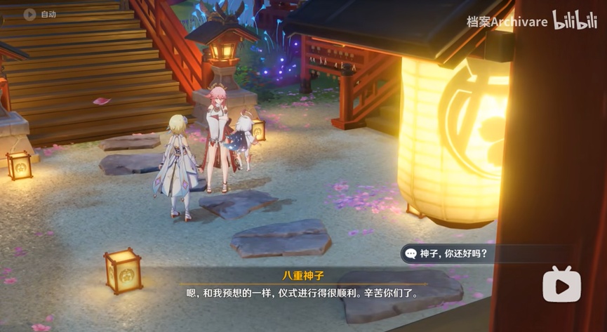 而以游戏实机画面进行动画演出的角色演示-「八重神子:仙狐宫司异闻录」中,也采用了以编写小说的“讲述者视角”贯穿整个剧情演出。在接下来的雷神个人线第二章,与八重个人线第一章中,《原神》编剧在八重这一角色上所做的无非两点: