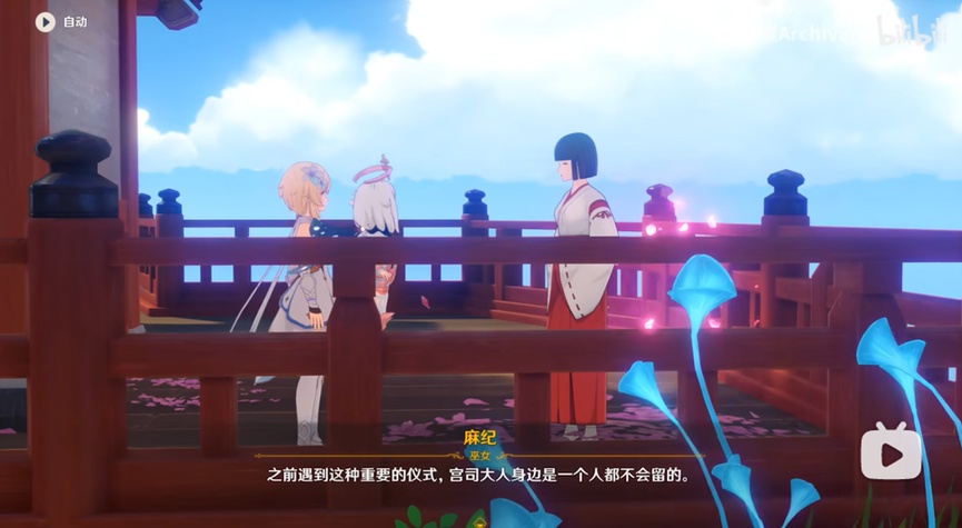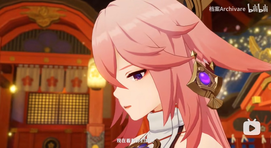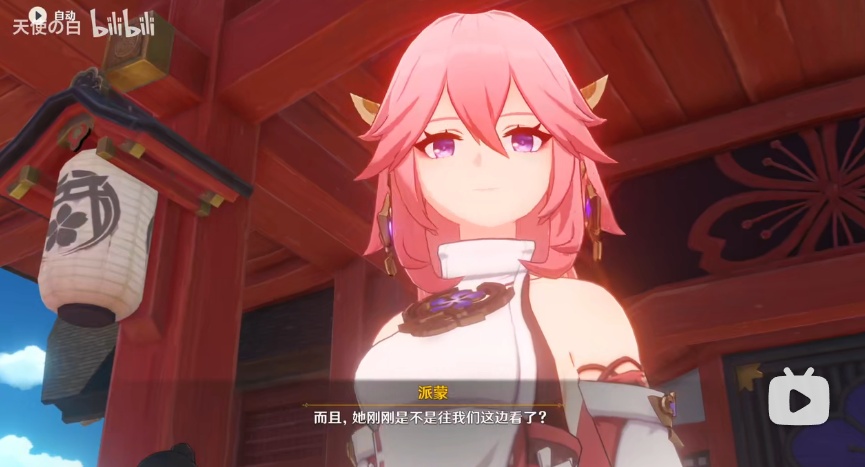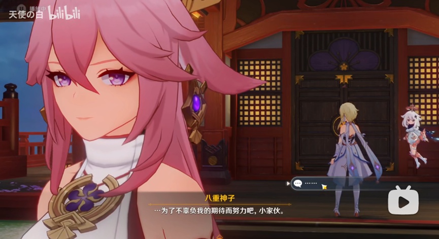 从仰视到平视,视角的转变同时也对观众形成面对一般稻妻民众时的八重与面对旅行者时的八重不同效果的心理暗示,同时,八重神子本身的语调,神态也发生了极大转变,眉头舒展,且眼神中多了几丝期待与独属于狐狸的狡黠。可见米哈游传统动画片演出效果功底之深厚,技术力之强。