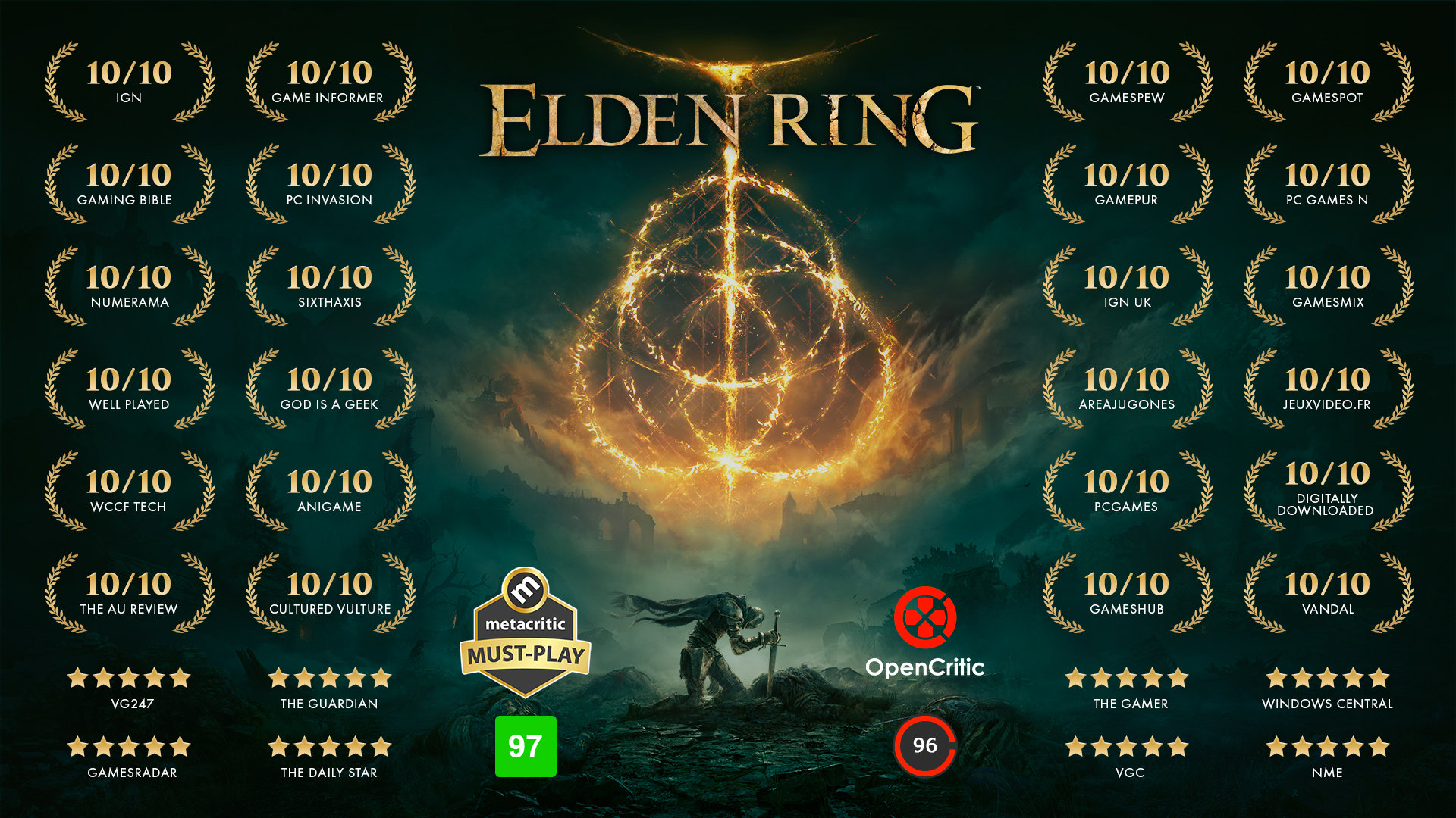 全球媒体评分解禁后,超百家游戏媒体种有将近一般都给了《艾尔登法环》满分,FS官方也没有错过这么大好的宣传机会,于是一张全是(10/10)满分的媒体赞誉图就发了出来。