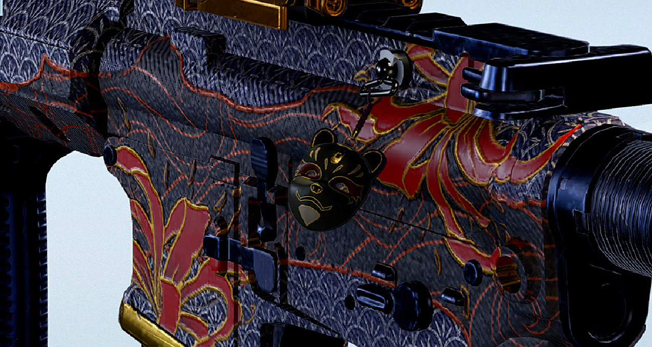 枪体以暗色为主,前半的浮云由红线描边深灰色的云朵,而在枪尾由立体拉丝的金属线条勾勒出抽象的祥云图案。枪身上有一只红脸长鼻妖怪形象,描述传说中的“天狗”。