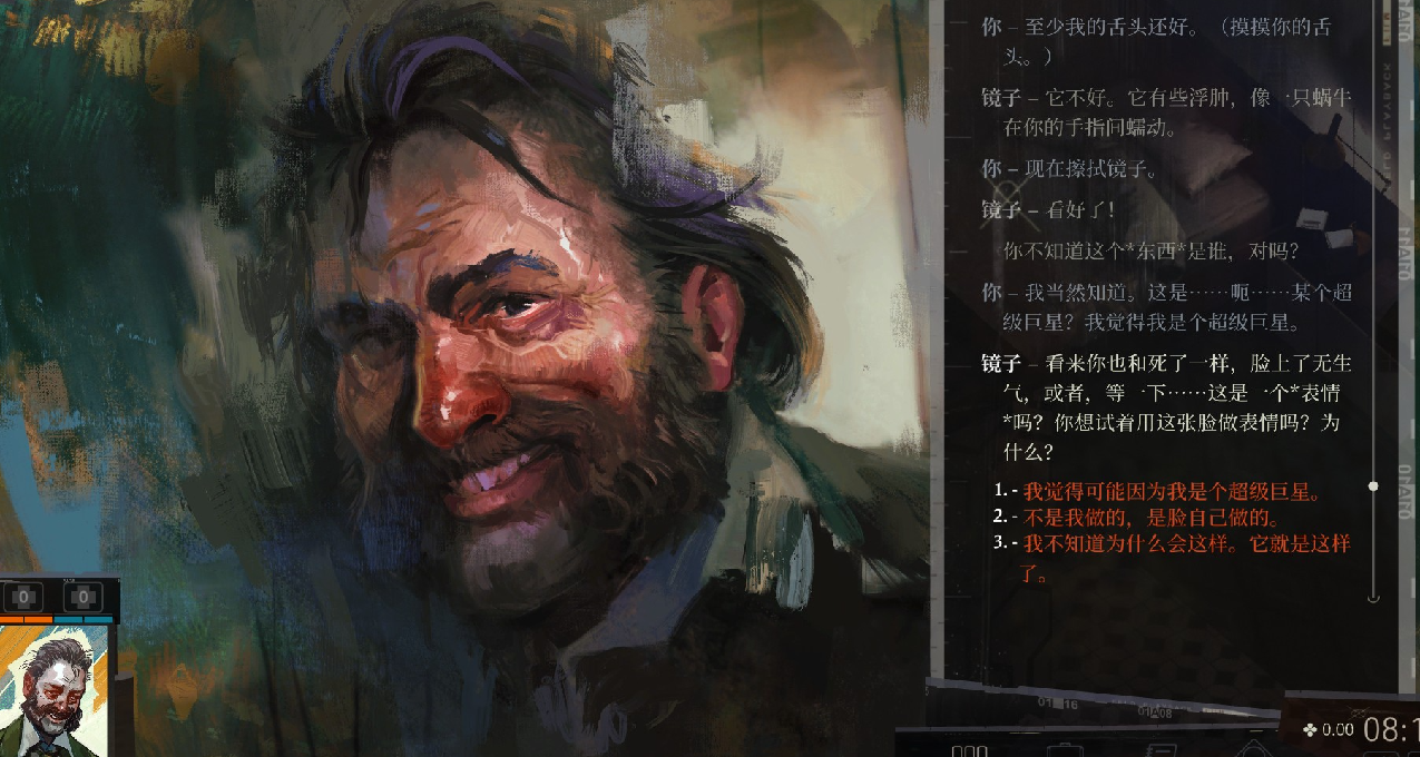 然后会看到挺长的一段脑内小剧场。根据角色起始技能点的不同,大概会有两种不同的版本,但核心内容相差不会特别大。我第一次读到这段小剧场,完全不知所云。但反正,最终主角被吵醒了,发现自己在一个满目疮痍,发过一场酒精洪水的房间里。