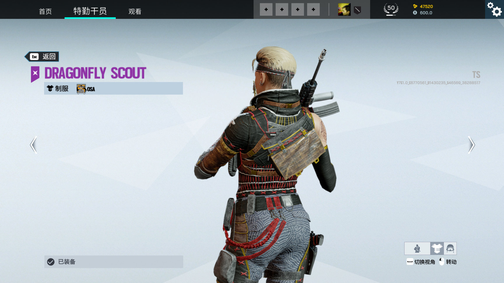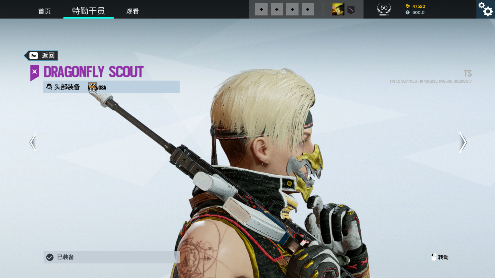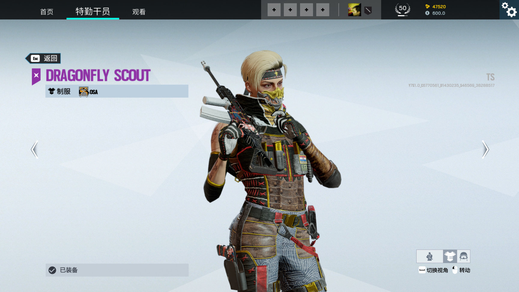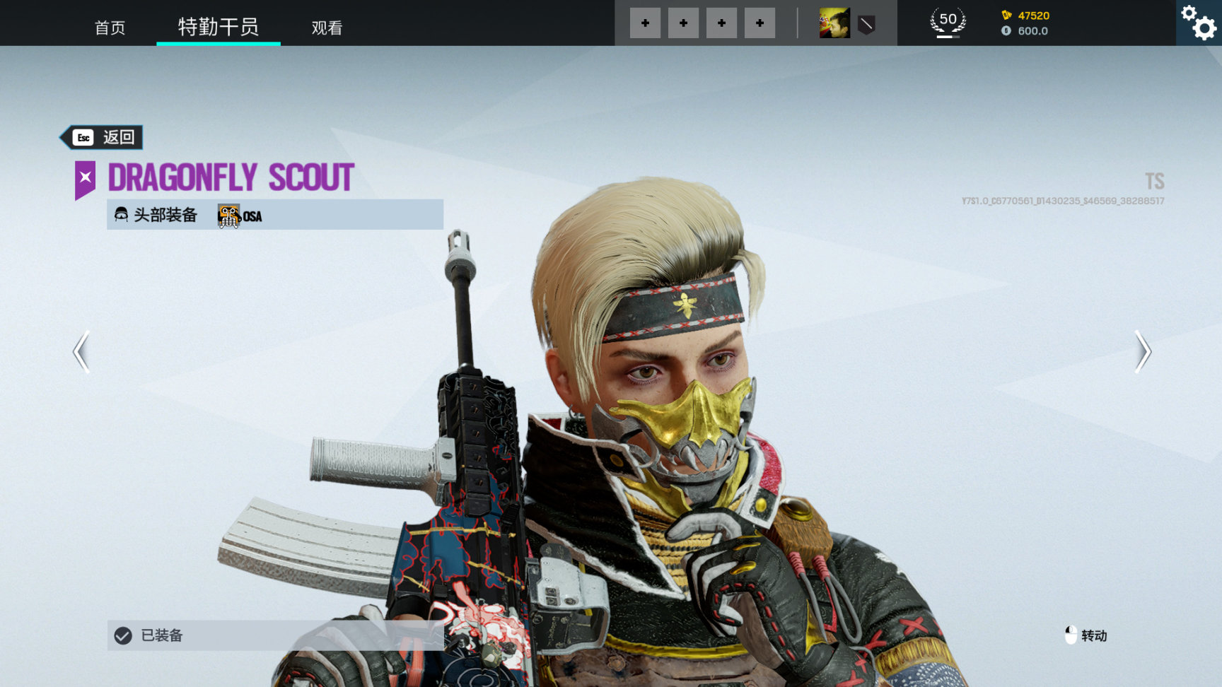 1. Osa干员,蜻蜓侦察兵同捆,头饰发带上有金色蜻蜓标志
