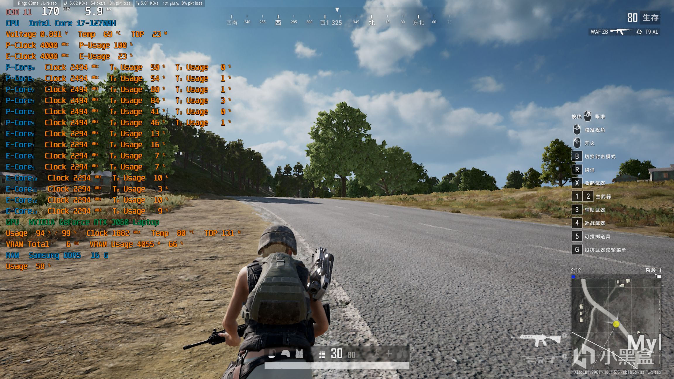 2K分辨率,全极高特效,帧率在160-170左右徘徊,小核也没什么占用,主要大核负载多一些: