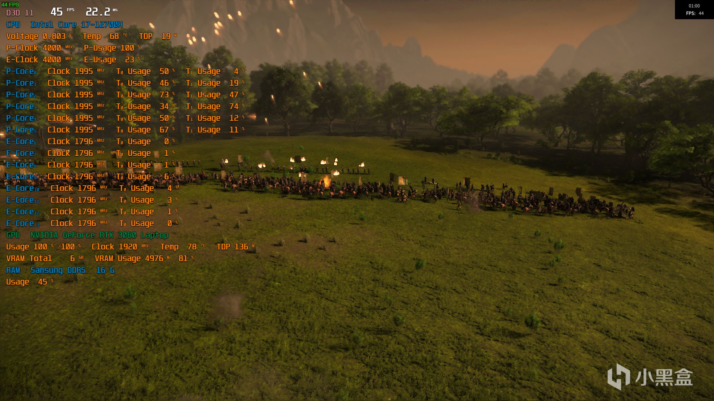 2K分辨率,画质预设极高,战争场景下平均帧率在45左右,此时大核的占用率比较高,小核基本不动弹: