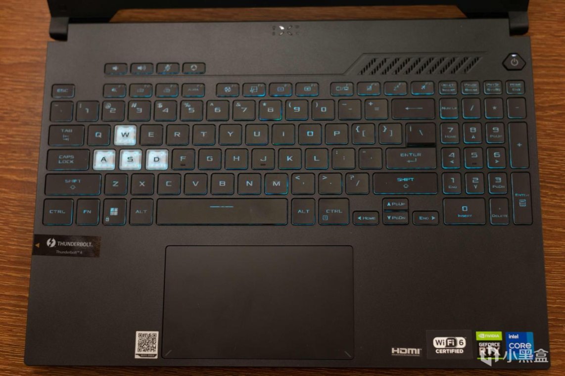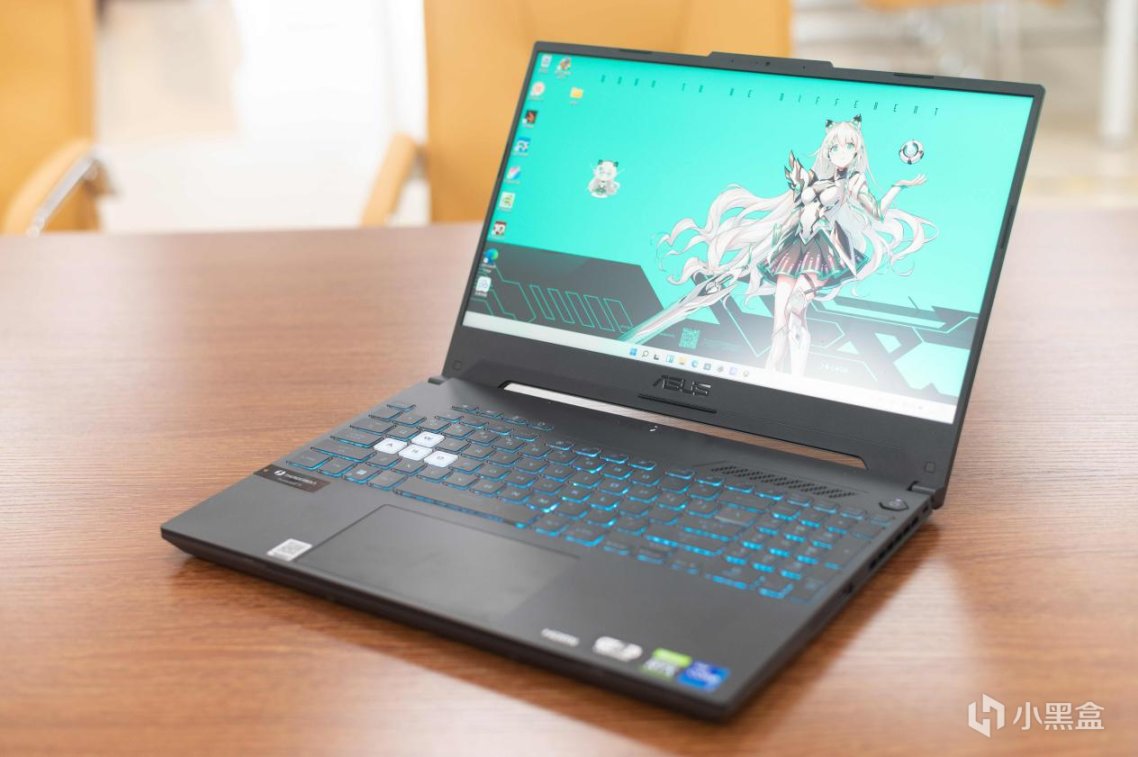 B面是一块15.6英寸的2K分辨率屏幕,三面窄边框,顶部有一定的额头凸起方便塞进摄像头,下边框略宽,中间因有ASUA的logo,默认的天选姬老婆壁纸还是这么好看,如果搭配魔幻青实用更佳: