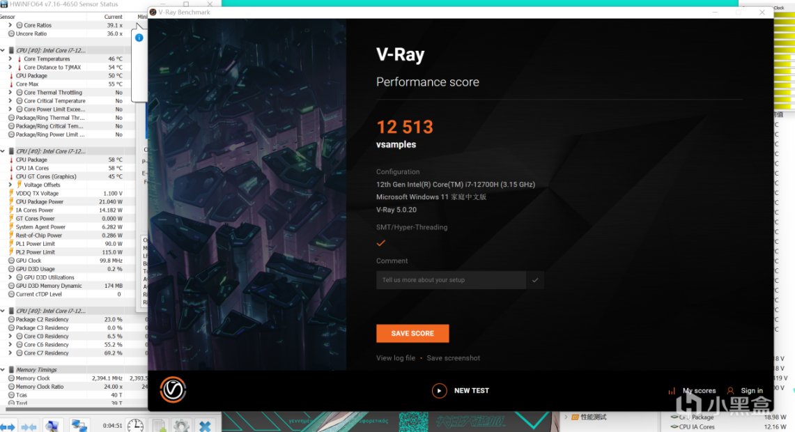 而在强调多核性能的V-Ray5 benchmark渲染测试中,也是跑出了12513的成绩。和桌面端的12700也低不了多少: