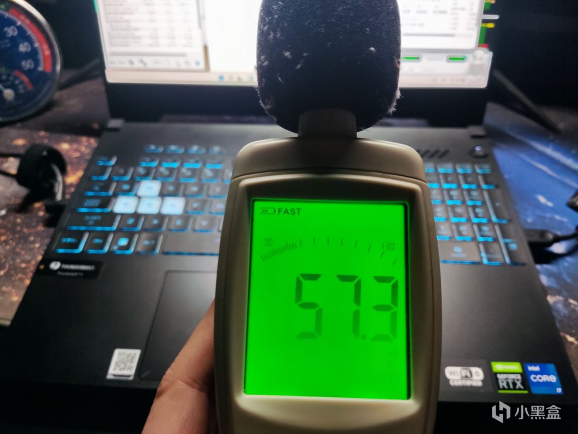 噪音方面,就不是那么尽如人意了,改进后散热受限于瘦身后的机身,可以遇见的是噪音方面小不了,高负载的情况下,人位噪音来到了57db,即使是在游戏本也属于偏吵的了:
