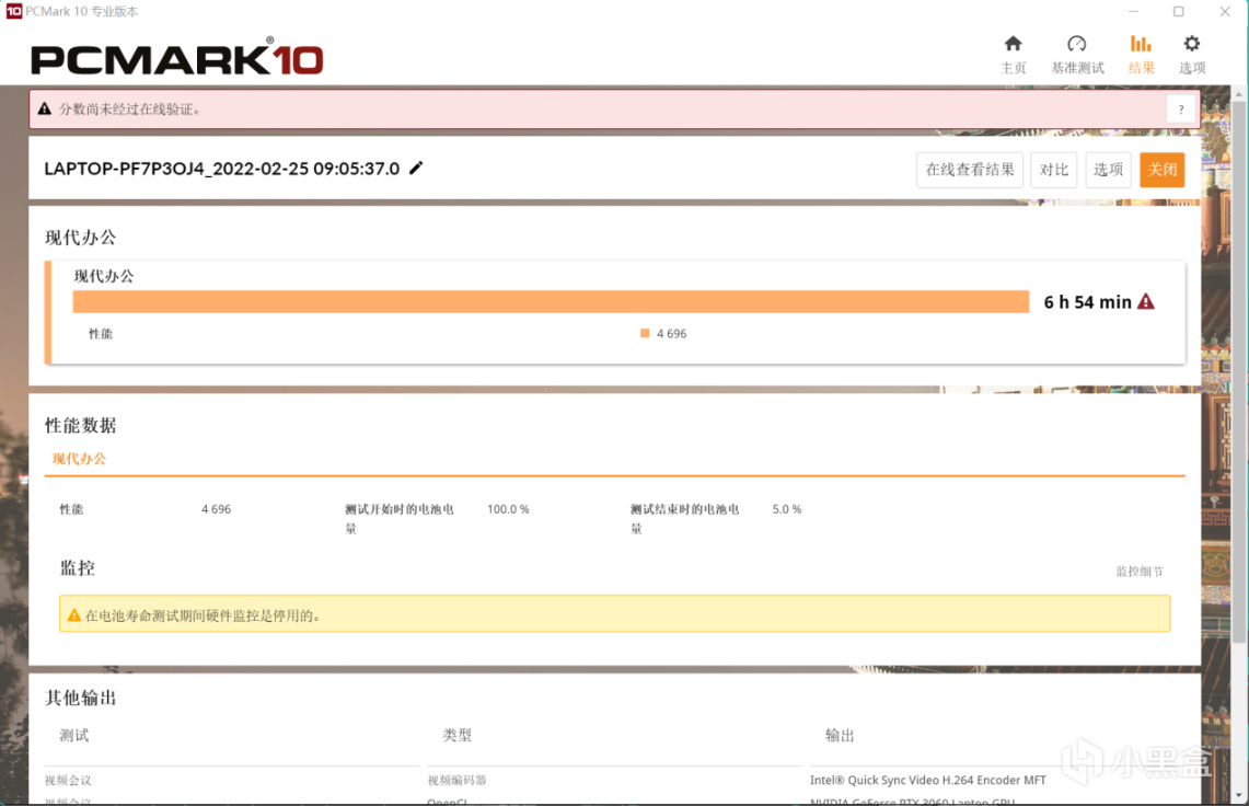 续航方面,本机采用了90Wh的电池,容量给的还是比较足的,在PC Mark 10的现代办公续航测试中,得到了接近7小时的成绩: