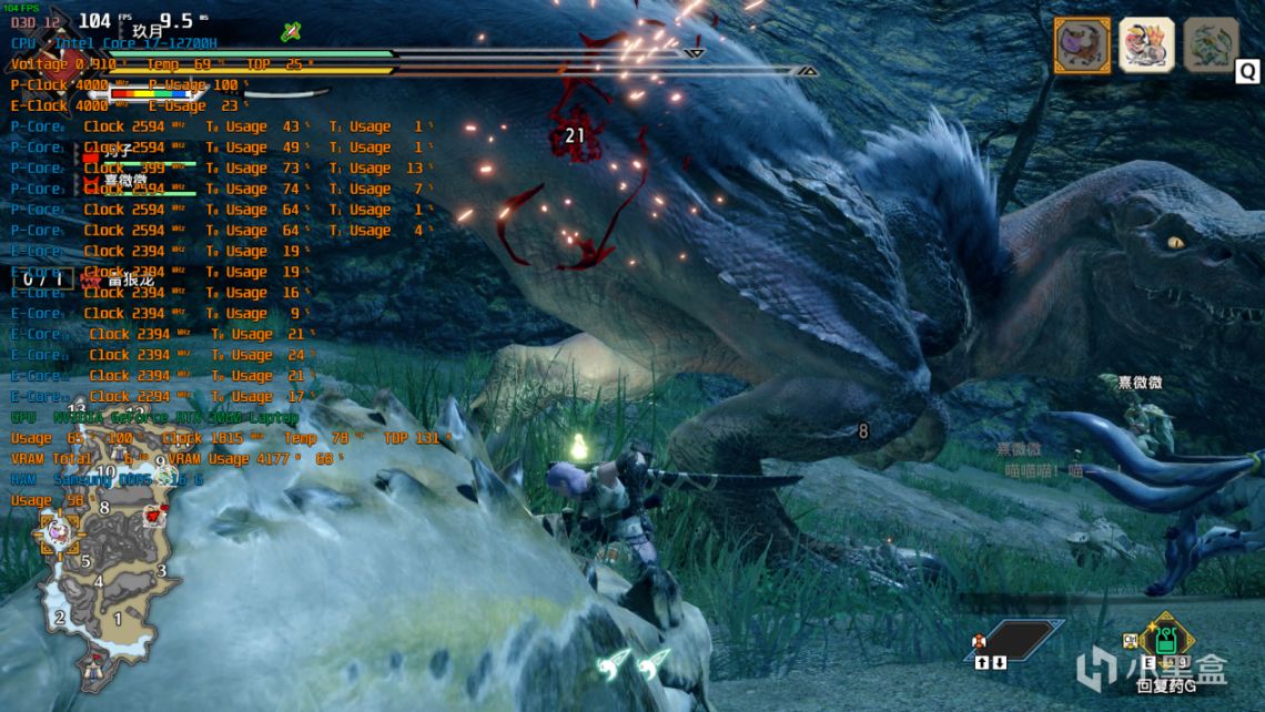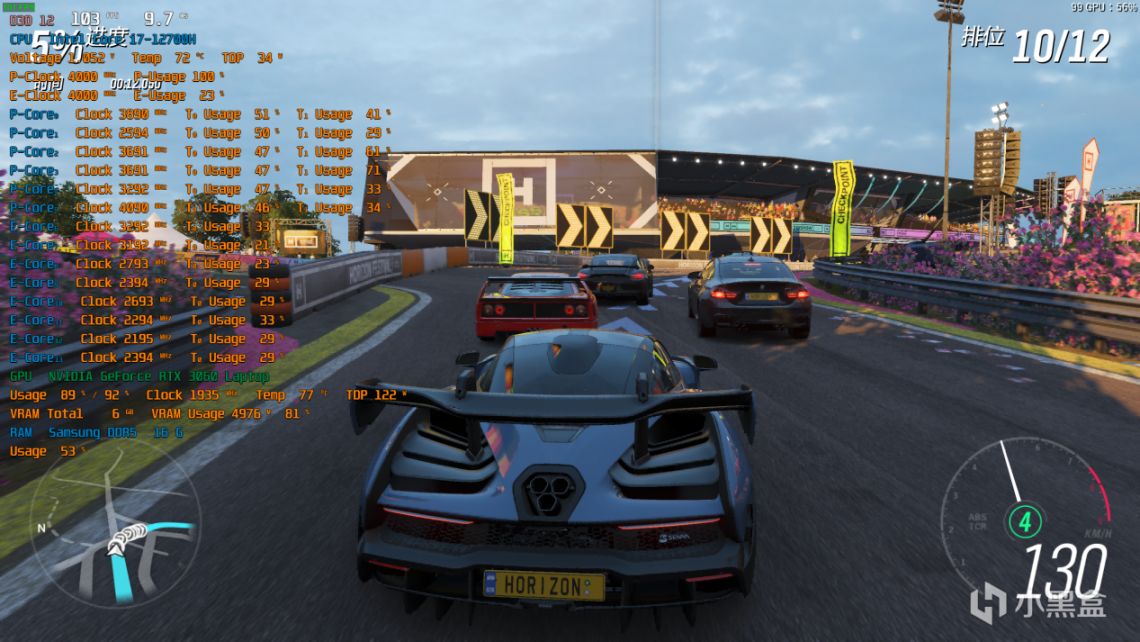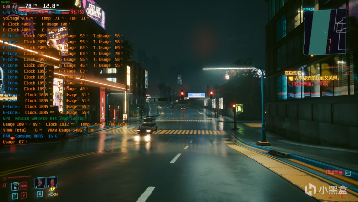 2K分辨率,特效全高,光追开,DLSS自动,可以看到大小核的负载都是比较高的,帧数平均能在75左右徘徊,少部分复杂场景会掉到60多。最高80出头: