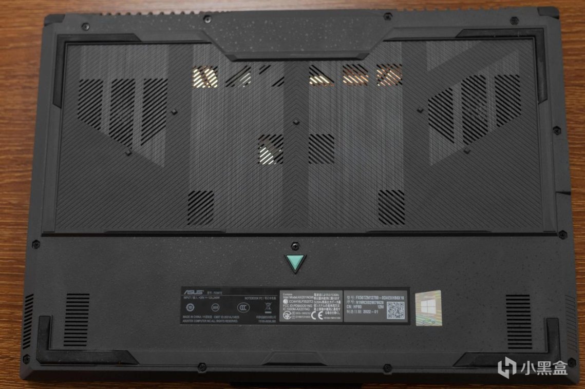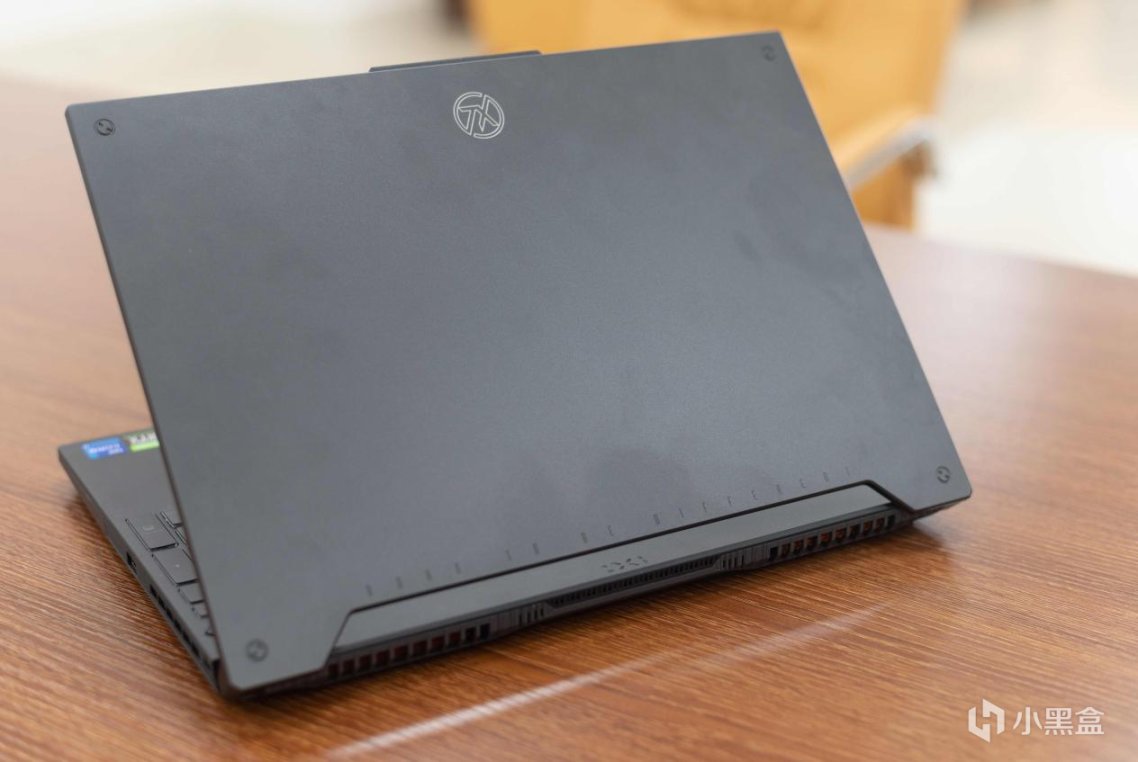D面和大多数游戏本一样设计的比较狂野,可以看到比较大的散热开孔,中间有个绿色小三角形脚垫点缀: