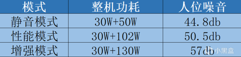 另外由于本机支持三挡性能调节,我们把不同模式的性能释放和噪音表现都试了试,结果如下: