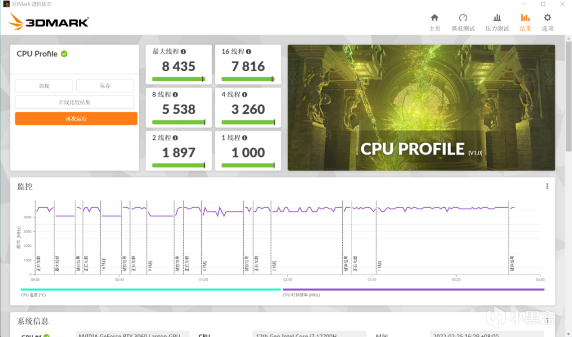 在3D Mark的CPU Profile性能测试中,跑出了最大线程8435分的成绩,这个成绩轻松吊打上代旗舰产品:
