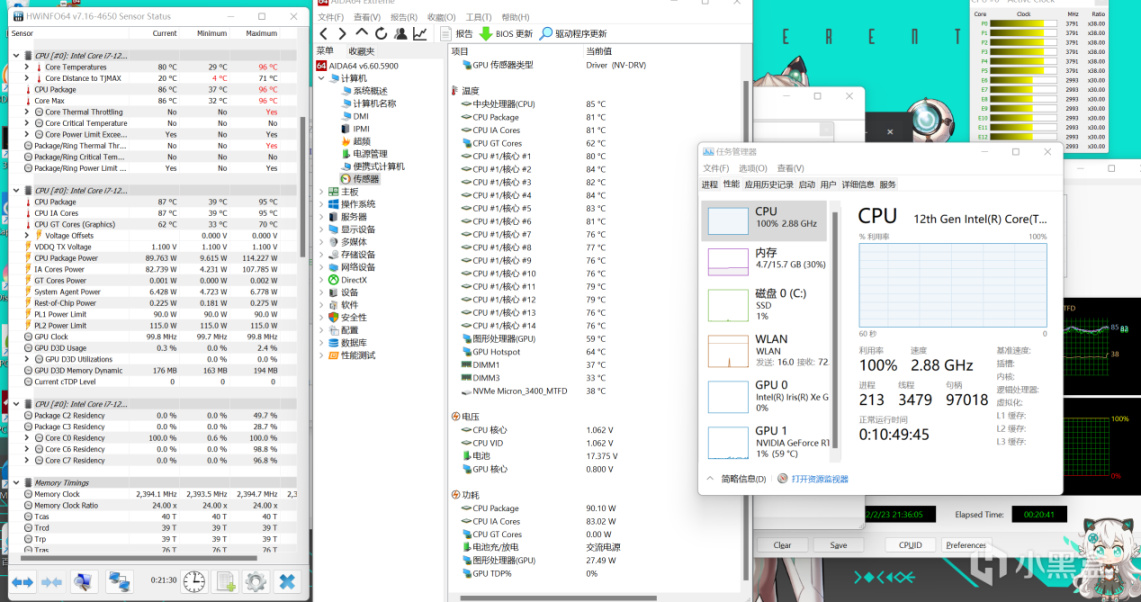 双烤方面,同样的20分钟,基本可以稳定在30W+130W左右的成绩。得益于改进后的散热设计,整机性能释放相当给力: