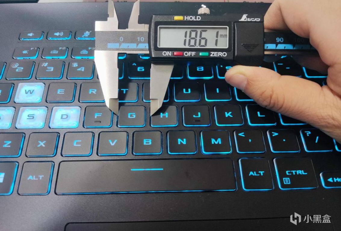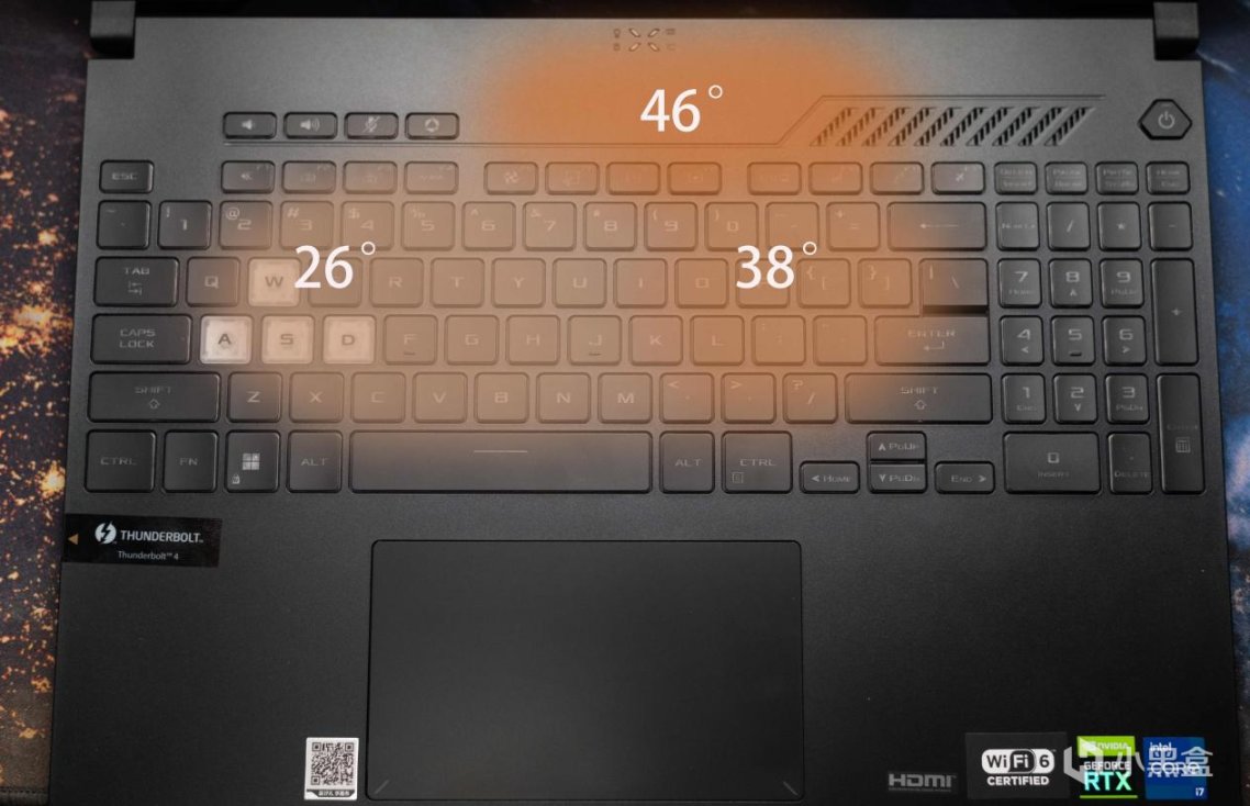 整个性能测试环节,表面温度控制的都非常不错,由于本机键盘左侧游戏区也承担一定的进风散热工作,所以这半边键盘温度并不高,高温主要集中在键盘右侧和上部靠近转轴中间的位置(室温12°左右):