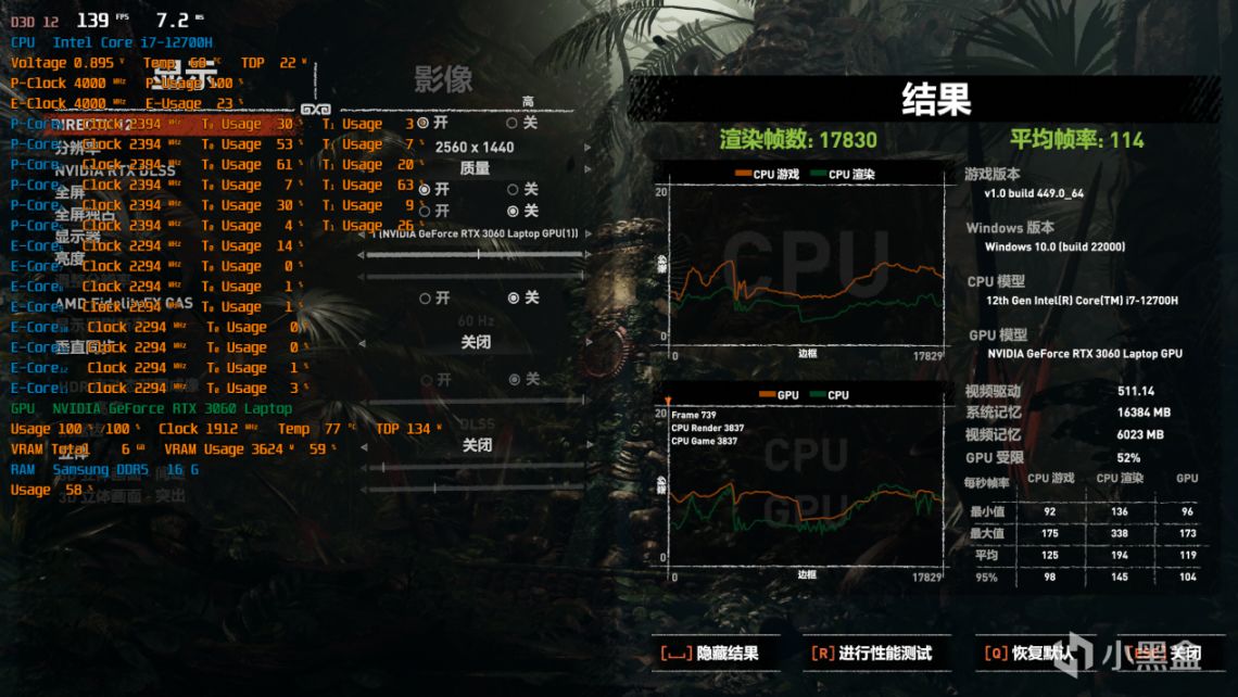 2K分辨率,影像等级高,这是直接跑的性能测试,平均帧率在114左右,主要压力同样集中在大核,小核没什么负载: