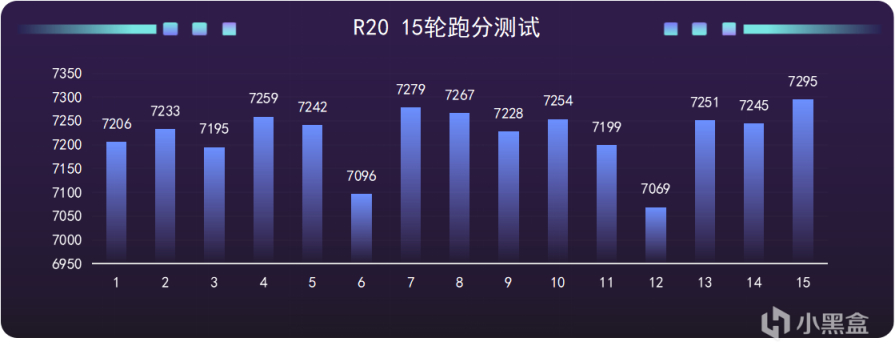 在CinebenchR20 渲染测试中,单核跑分跑出了697的成绩,而在15轮的多核跑分测试中,有一定波动但基本都在7100,7200左右徘徊,这个成绩也是相当可观,要知道桌面端的12700跑分也才多1000多:
