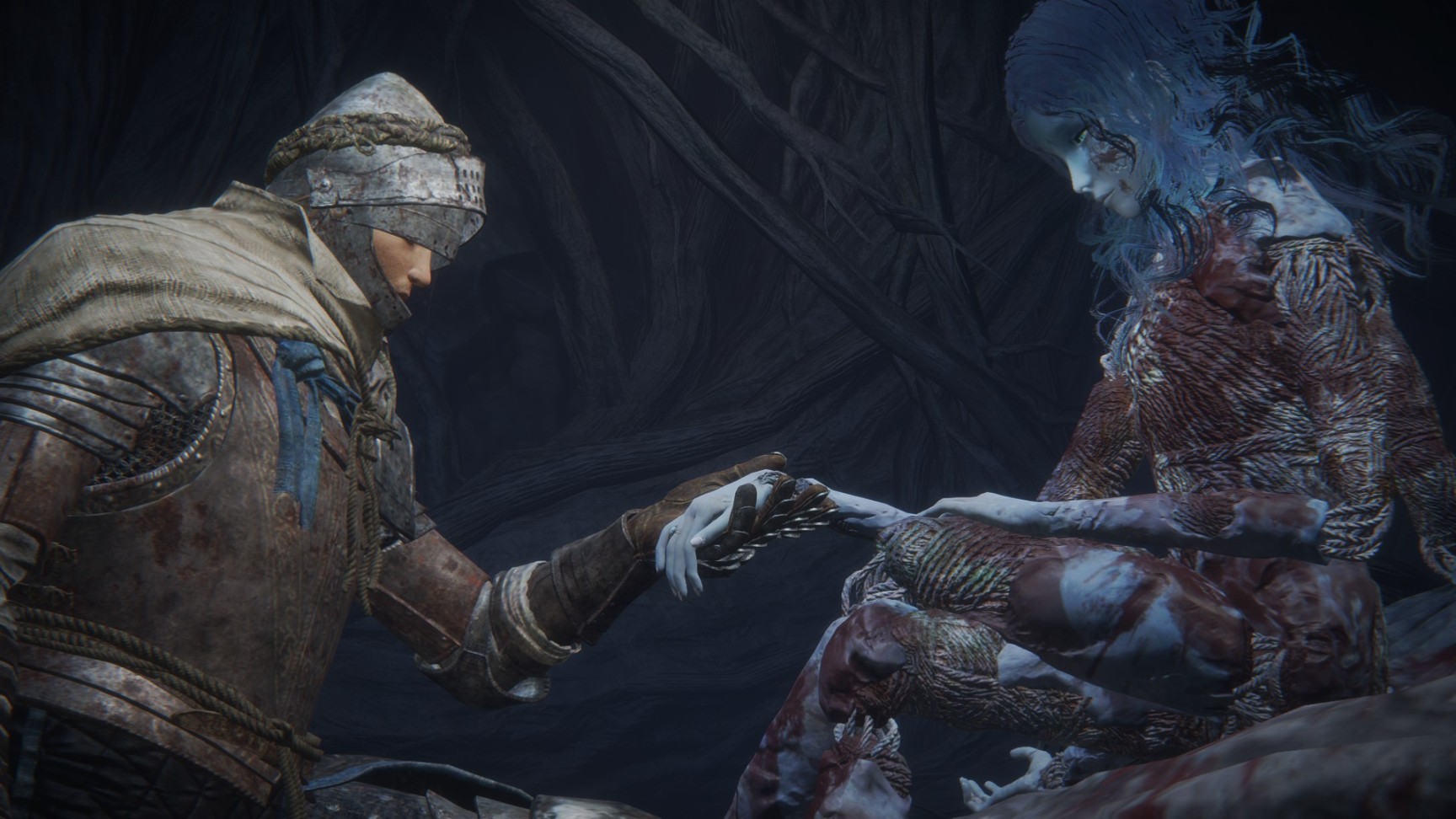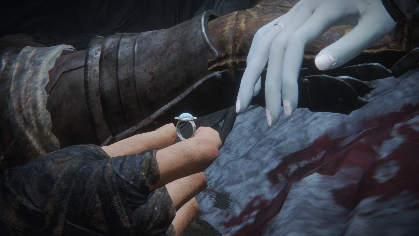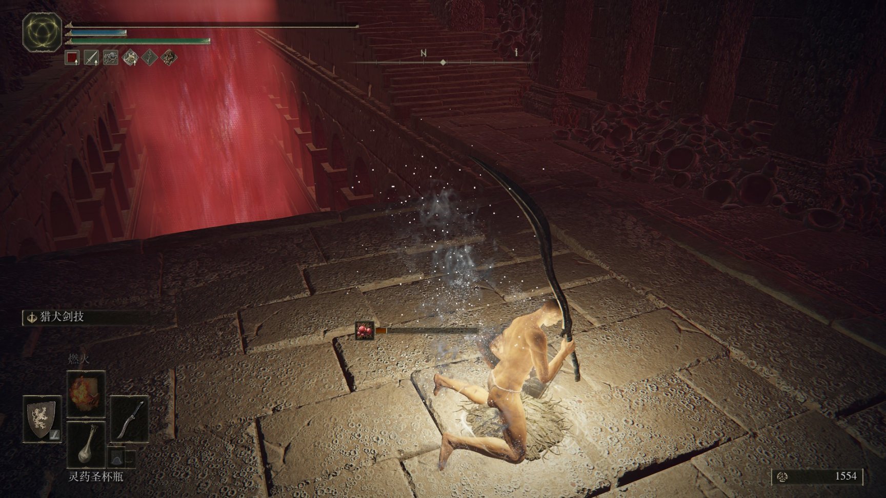 我不知道菈妮是否在暗示着什么,我只知道我的新旅途又开始了。我回到与她分别的地方,顺着她离开的方向迈开了步子。这一次旅途实在艰辛,连一直都在陪伴我的灵马托雷特也不能跟在我身边。地底的阴暗,猩红的血池,无数次的战斗与跌到在胜利的前夕更是让我内心充满戾气。磕了牺牲露滴酿成的灵瓶的我不顾后路,提着猎犬长牙一路砍了过去。