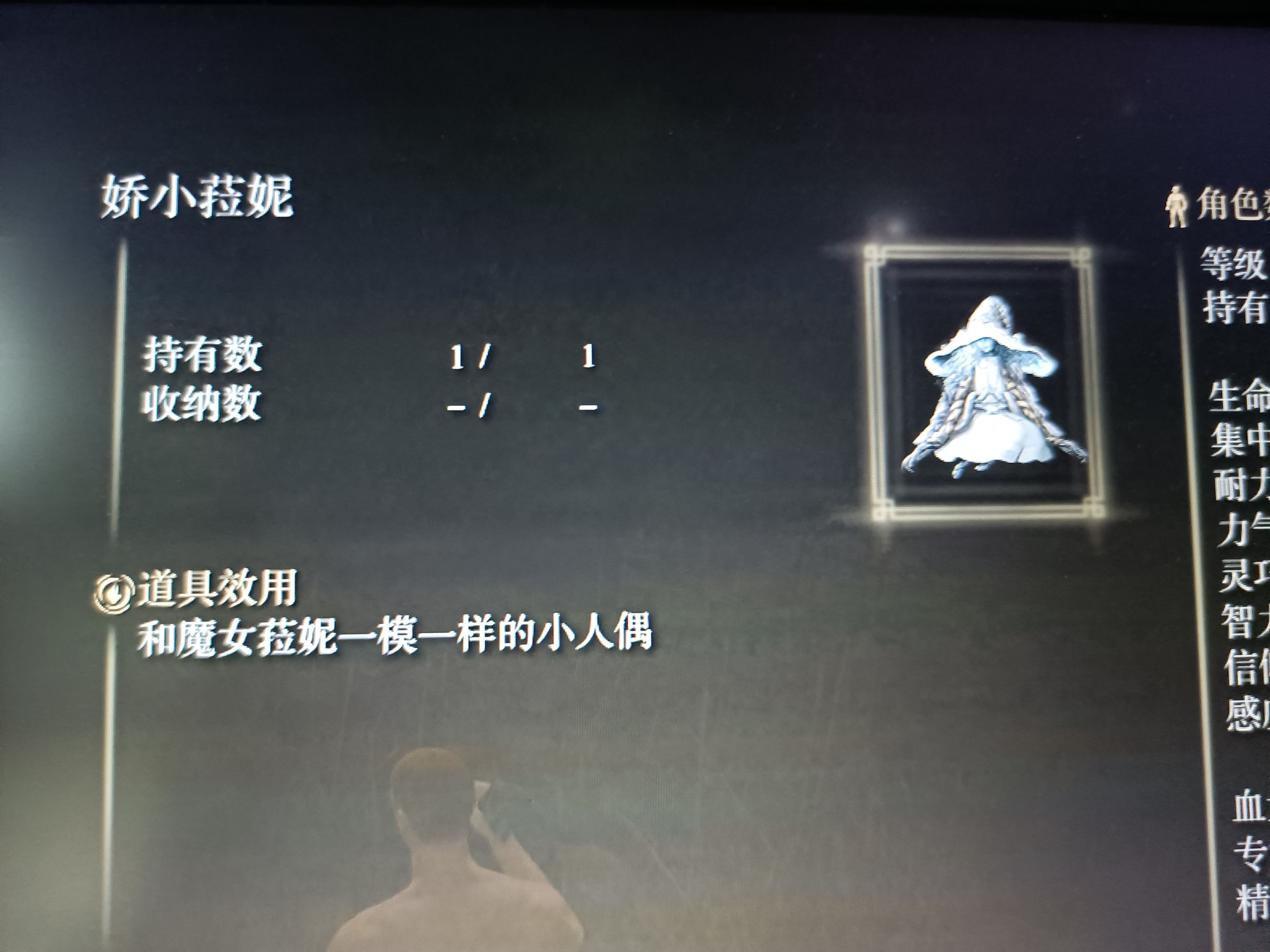 不知走了多久,在一个赐福点边坐着休息的时候,我拿出人偶,心不在焉的把玩着,睹物思人,思绪不知道飘到了哪里。心里突然一阵忍不住的寞落,情不自禁的对着人偶说起话来。“受不了你了”突然耳边传来熟悉的声音,我一愣,打量了一下四周,然后死死盯着手中的人偶,忍不住的欣喜若狂,这是菈妮的声音!菈妮与我说了说话,解释了她身为半神,不愿意受到别人操控从而到这个地步的原因,还有狼人兄弟是她的护道者等等。同时高傲的魔女表示不喜欢这个样子展示给别人看,所以要求我去打败前来阻挠她的影子,不容我拒绝。我笑着答应了她的请求。在一番激战过后,我顺利打败了影子,她恢复了原来的样子。她说她要继续她的道路,让我去继续我自己的旅途,不必再追随她。她给了我一把钥匙,在我还在沉默的时候便离开了。 看着她离去的方向,我握紧了又松,松了又紧手中的钥匙,往前迈了两步,最终还是停了下来。