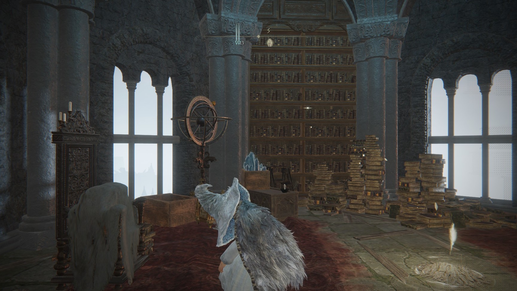 身为一个智障莽夫,为了减轻重量,一路上我几乎全裸着进行一个人孤独的脱机旅途(其实是根本登不进服务器)。在快乐的纵马驰骋在卡利亚王室的遗迹上时,我发现了悬崖边矗立着三座魔法塔,经过一番折腾我登上了第二座塔,顶楼的房间正坐着我心心所念的的雪精灵般的魔女,猝不及防的我不顾还光着身子就记录了这让我无比激动的一刻。