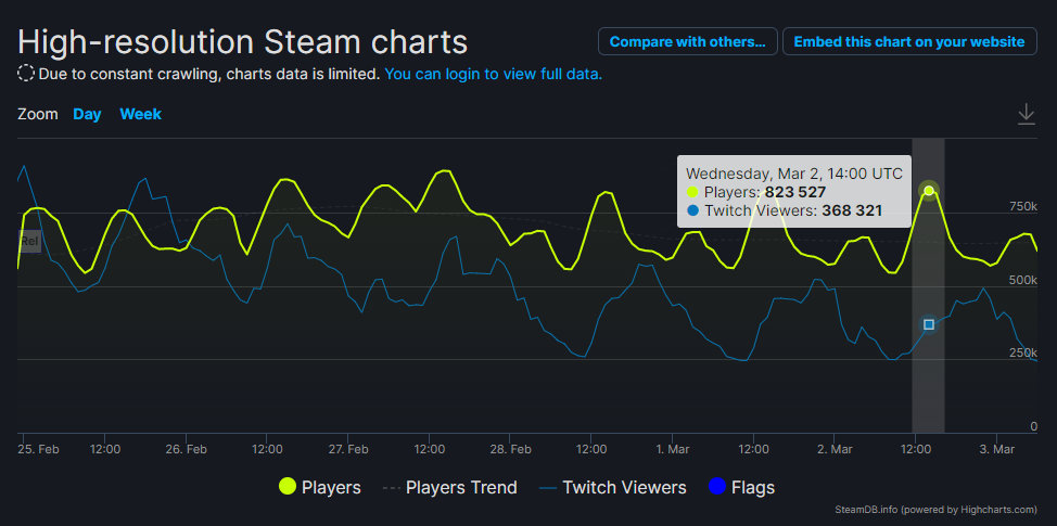 《艾尔登法环》发售后的六天当中,游戏每日在线峰值也都在80万以上,在这个周末或许能够冲击下突破90万大关。