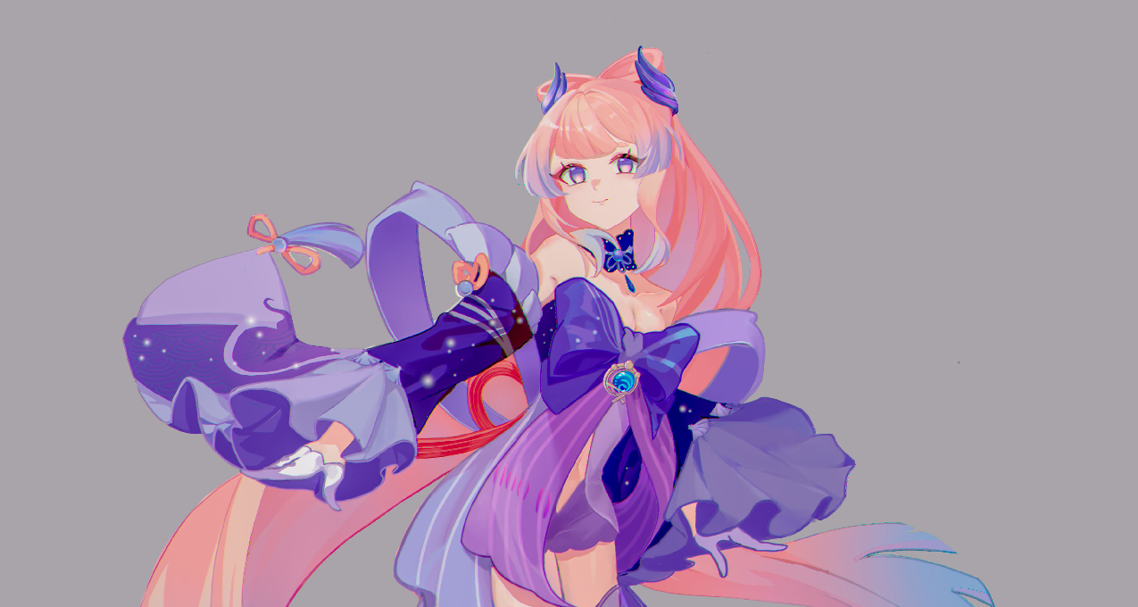 线稿阶段先要塑造一个可爱的感觉,心海又是水系,用了C型,再结合头发和裙子体现人物的飘逸感!