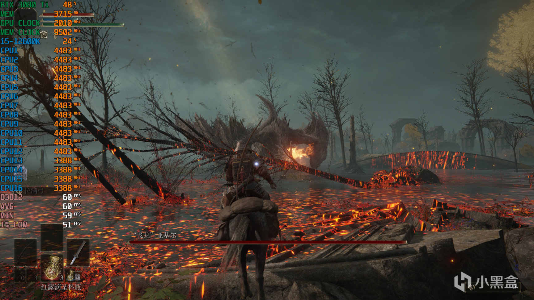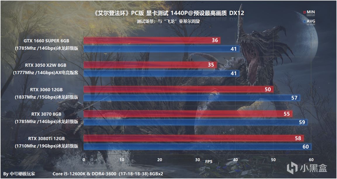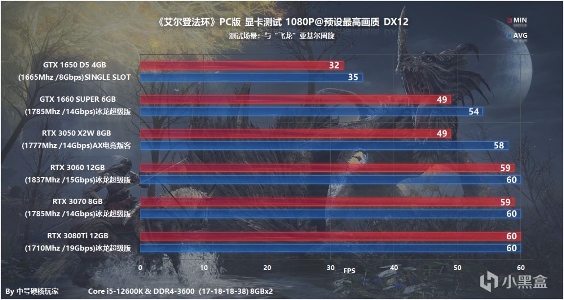 在《艾尔登法环》中,推荐RTX 3060 12GB冰龙超级版,2K分辨率预设最高画质,在绝大部分正常野外场景,平均帧率能达到57fps,游戏中温度控制在60℃出头,标称Boost频率为1837Mhz,实际会比公版会高一点。