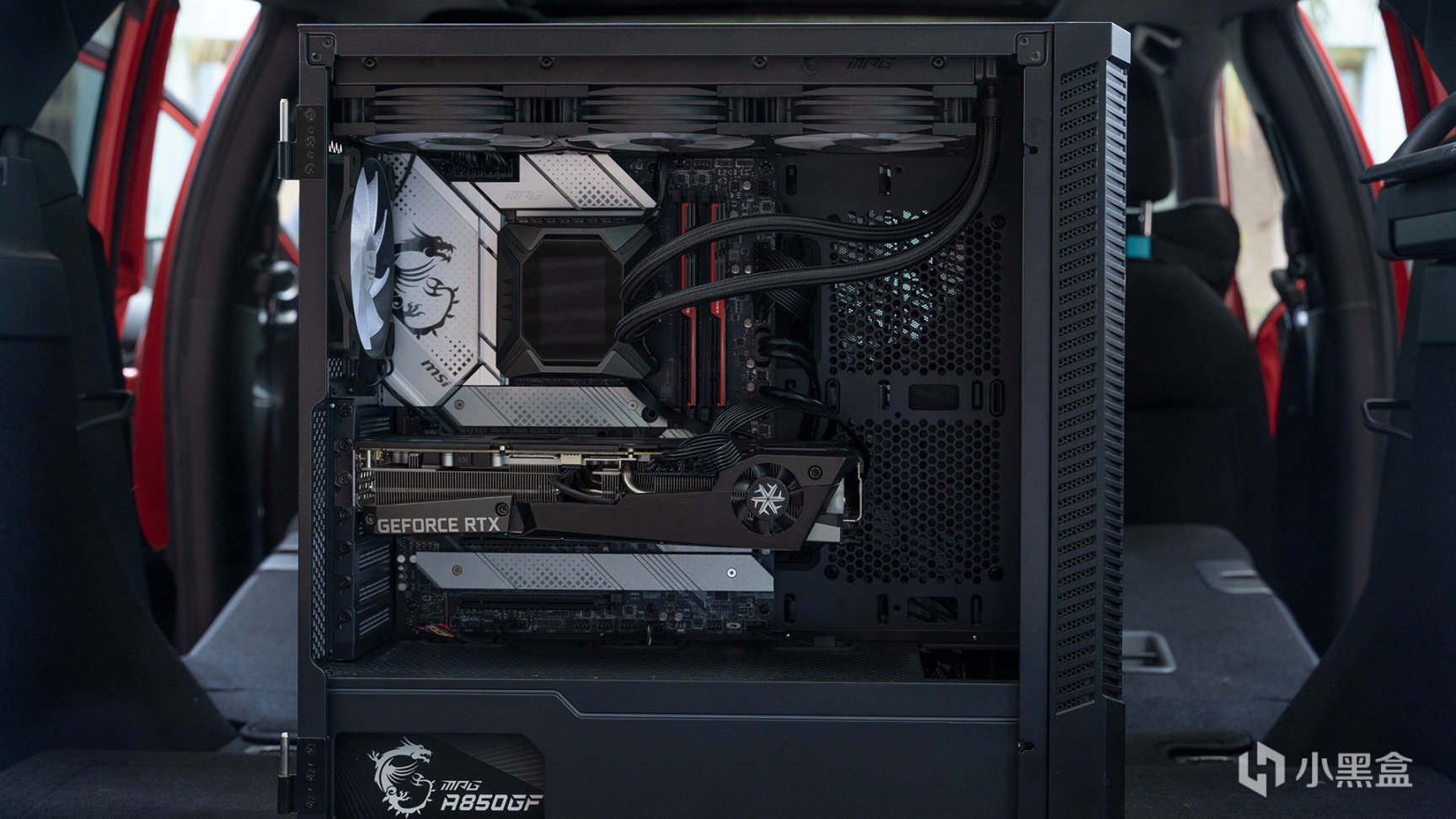 内部硬件,CPU是i5-12600K搭配微星MPG Z690 EDGE TI WIFI主板,两根芝奇TridentZ 8GB DDR4 3600开X.M.P(17-18-18-38),CPU水冷采用微星MPG CORELIQUID 寒霜K360,采用2.4英寸LCD屏幕和第七代Asetek水冷方案,个性和性能一样都不少,驱动整个机器的电源是微星MPG A850GF,全日系电容用料和850W额定80 PLUS金牌认证,能保证这台高端机器长期稳定运行。