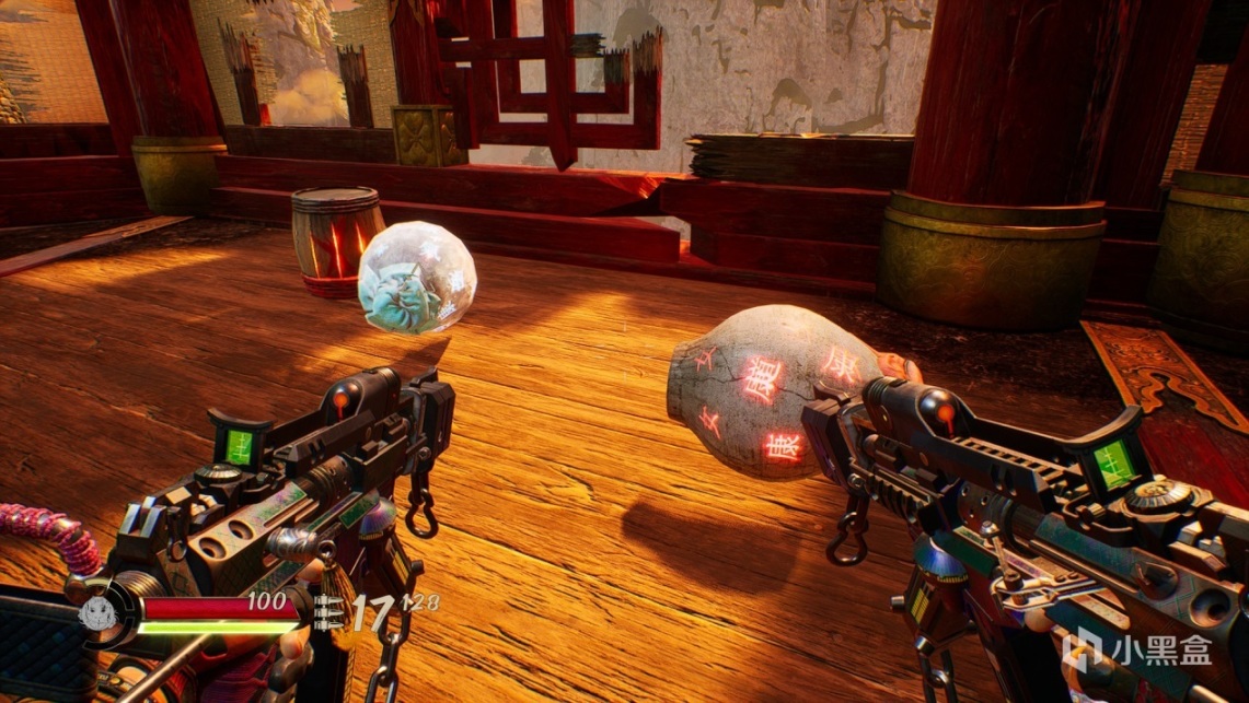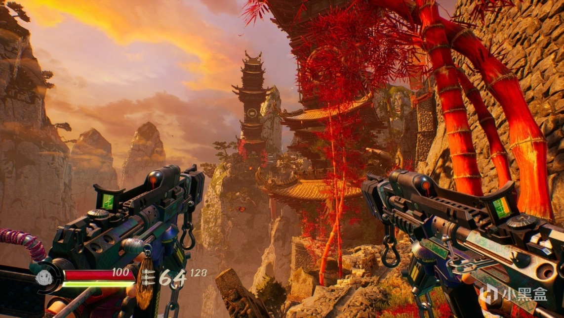 游戏角色近战远程兼具,刀刀到肉的近战虽然是我的至爱,但射击的手感同样非常优秀。主角使用的枪械有手枪“法外狂徒”、霰弹枪“镇暴”、双持冲锋枪“超级跟班”、榴弹炮“赤色公牛”、蓄能重炮“石化蜥蜴”以及一把弩弓“手里剑喷子”。富有机械感的暗色为整体,金色为主的纹路,其他漆色为辅,三者结合,四把枪械既古朴又大气,而冲锋枪的红紫漆色又带有一丝机械朋克的韵味,总体来说非常好看。而手枪、霰弹枪、榴弹炮、蓄能重炮单发射击时的厚重和力量感,双持冲锋枪连续射击时的沉稳和节奏感,突突突时的体验绝佳。