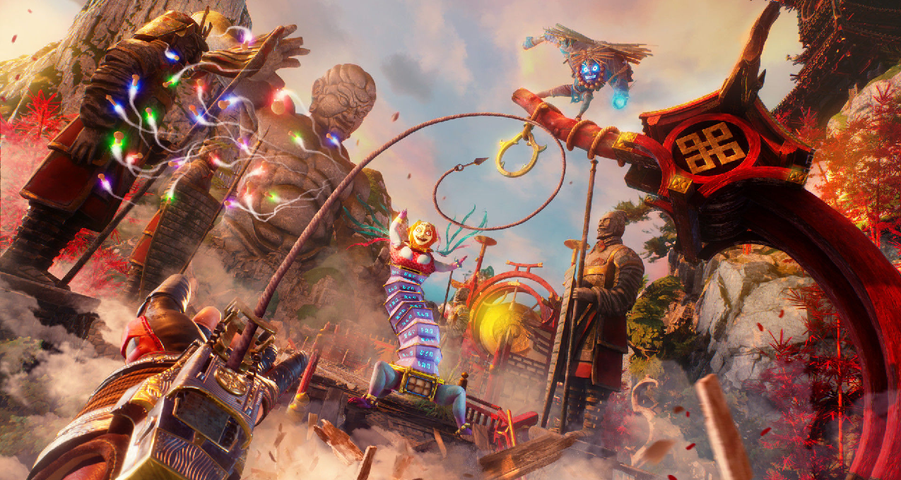 而近战除了武士刀攻击,游戏里设置有“处决技”的机制,并进行了一定程度上的创新。积蓄能量满格后玩家可以对几乎所有的敌人使用处决技,可剥离敌人身上的某个部分作为武器,(名为“残杀武器”,场面确实很粗暴刺激),不同敌人身上的武器具有不同的作用,以及都存在一定的时效性,合理的使用处决技能具有不错的杀敌效果和视觉效果。“残杀武器”是“处决技”这类型玩法中一个不错的想法。(因动态图片过于残暴无法放图)