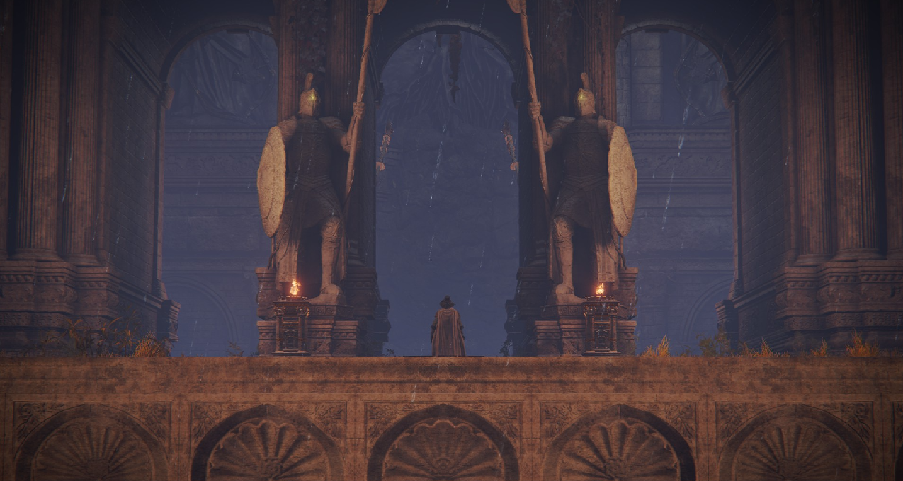 往前走会看到有火喷过来,我们用武士自带的弓箭把喷火柱子给降下来,然后往前走就来到一个殿堂,殿堂雕像下面就摆着我们此行的目的——护符“黄金树的恩惠”。