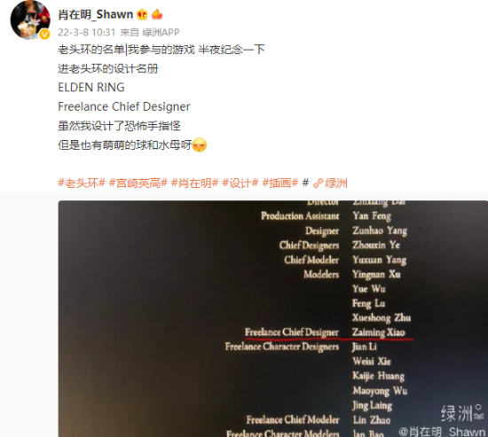 国人设计师肖在明在微博发文纪念自己在《艾尔登法环》中的设计参与过程,他的名字也出现在了通关游戏后的制作人员表中。