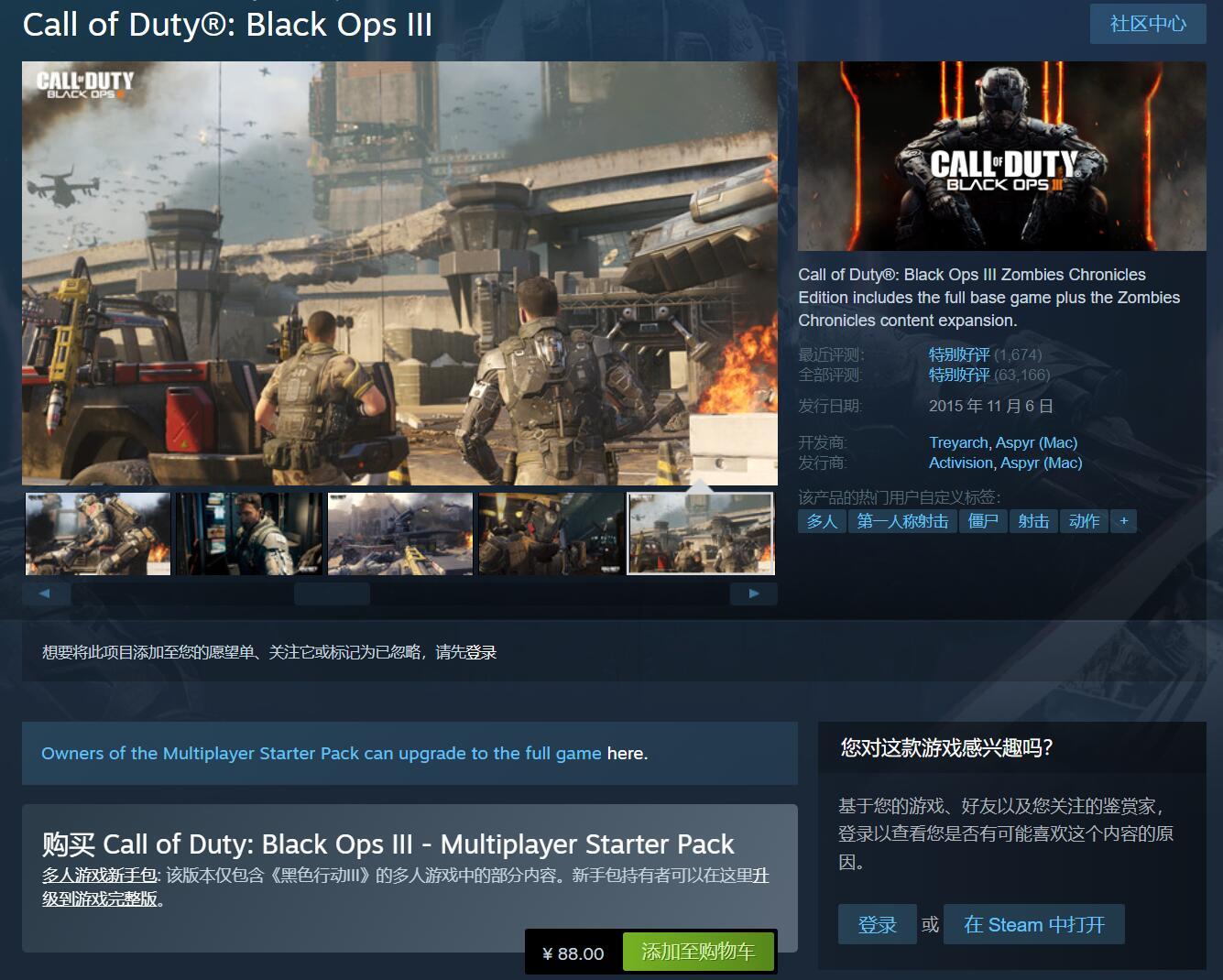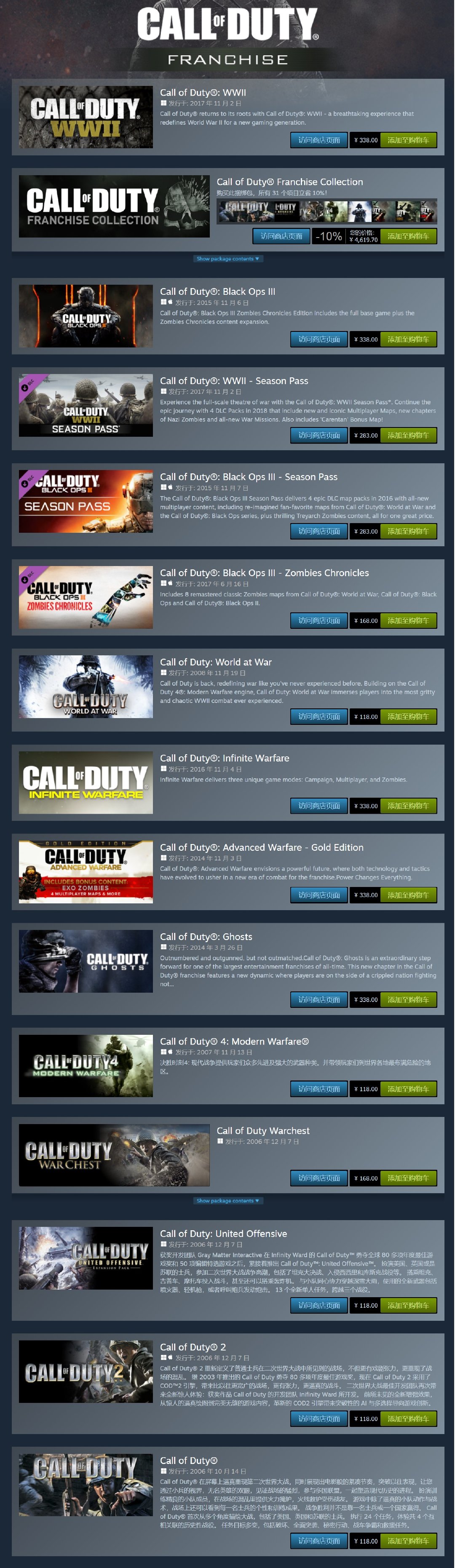 当然Steam上面的《使命召唤》游戏都是一些多年前的老游戏,最新的几部《使命召唤》都没有登陆Steam,而是动视暴雪战网平台独占。而这些老游戏的Steam国区售价还挺高,不推荐原价入手。