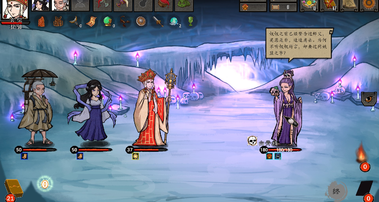 不过呢,慈悲为怀的出家人也是免不了打打杀杀的,有时甚至还有些“阴险小人”的味道。例如,玄奘可以选择牺牲同伴来恢复生命值或是造成伤害,或是命令同伴给自己挡刀,或是直接将其献祭来永久提升自己的力量。如此行径可就并非玄奘该有的形象了(笑)。当然了,行大事者不拘小节,只要玄奘活着,旅途就能一直进行下去。