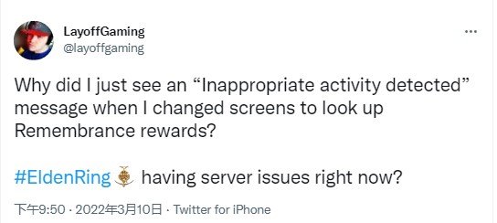 《艾尔登法环》已经发售两周多了,官方已经修复了不少问题,但不知道为何,近日多位国外玩家表示在正常在线游玩《艾尔登法环》时,无缘无故被检测到作弊,然后强行被踢出游戏,再登陆时已经不能连接到服务器,只能离线游玩,昨晚我们也遇到了这种情况,根据微博网友反馈,不少国内玩家同样遇到了这个问题。