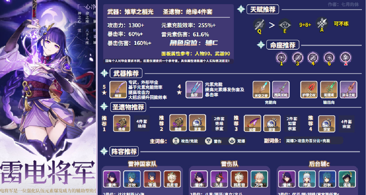hello~大家好,这里是“七休”呀,本期带来的是七神之一,稻妻国的雷神「雷电将军」的天赋、命座、圣遗物、武器、阵容搭配细致且全面的培养攻略!