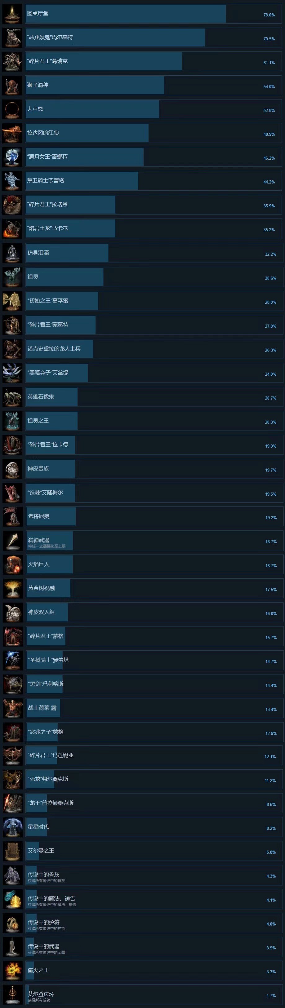 根据Steam成就统计,目前已有超过7成的《艾尔登法环》玩家打败了第一个主线BOSS恶兆玛尔基特,有61%的玩家继续探索史东薇尔城并击败了接肢葛瑞克。