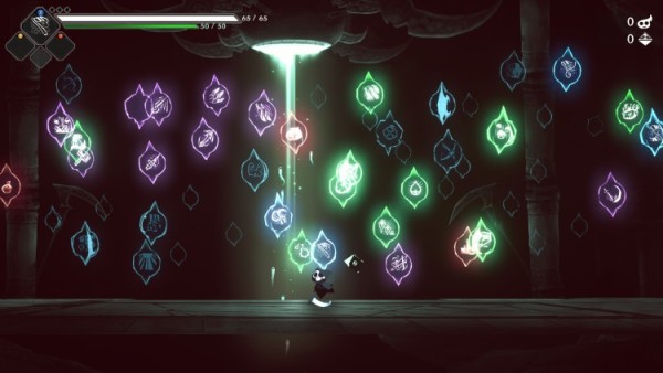 没有随机的主武器,固定的主武器镰刀将伴随整个游戏流程,将各式各样的武器作为道具加入游戏,使用蓝量限制武器道具的使用频率。同时为了加强主武器和武器道具,游戏提供了可选择的各种buff,强力buff也会有负面buff加以限制,buff的用色也是经典的红,绿,紫三色。相比于武器道具,主武器的攻击方式显然更加多变,基础的四向攻击,向上攻击能位移一段作为二段跳使用,左右的流畅连击手感,向下的俯冲坠击加上左右的横扫,基础武器更是在强化之后能够挥出剑气。使用假条这一道具,更是可以升级镰刀类型,将近战的镰刀扩大攻击范围变成中距离的武器,又或是升级成适合连击的攻击类型。