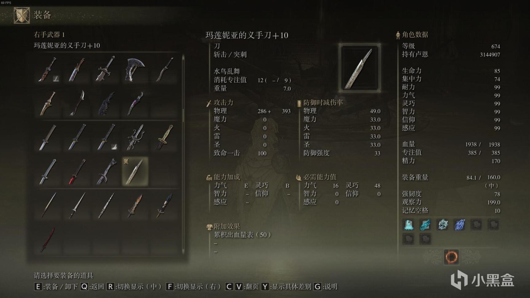 这把武器也是呼声极高,面板并不是极为突出,且有着大部分刀本身自带的出血值。义手刀对灵巧需求很高,有足足48,但战技也是相当暴力。同女武神一模一样的水鸟乱舞,只是没有女武神的高霸体。一套战技打完爆发极高,基本上一周目大部分BOSS一套刮完半血没了。出血值不算高,往往一套打完出血出不了,得再打一套。本想给四星,因为义手刀上限并不高,主要靠战技打输出,而这种贴脸战技霸体并没有很高,周目高了很容易一巴掌被拍死,但是强在可以使用它的中期,以及实实在在暴力的输出,还是非常推荐的,真论评分应该得是四点五,到不了最高。