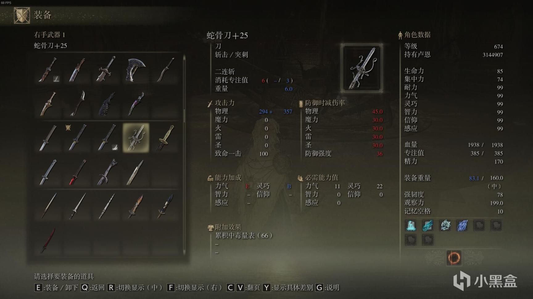 挺多人都有这把刀,而这把刀的特殊之处不只是它本身自带的毒,还有它的重击。蛇骨刀的基础面板较为不错,且自带一定的毒,在前期是比较好用的,在往后的推进中逐渐萎靡。它的特殊重击为横扫二连斩,比较帅但个人认为不如一般太刀的重击,一般太刀的重击是突刺属性,是可以触发反击(30%加伤)的,带突刺的武器都厉害,且环中弱突刺的怪物不在少数。战技同尸山血海,只是没有它的长度,攒毒量一般,战技不弹刀,如果要攒毒我更宁愿掏匕首,22的灵巧在开荒期也不好用,只在前期适用一点,不算推荐