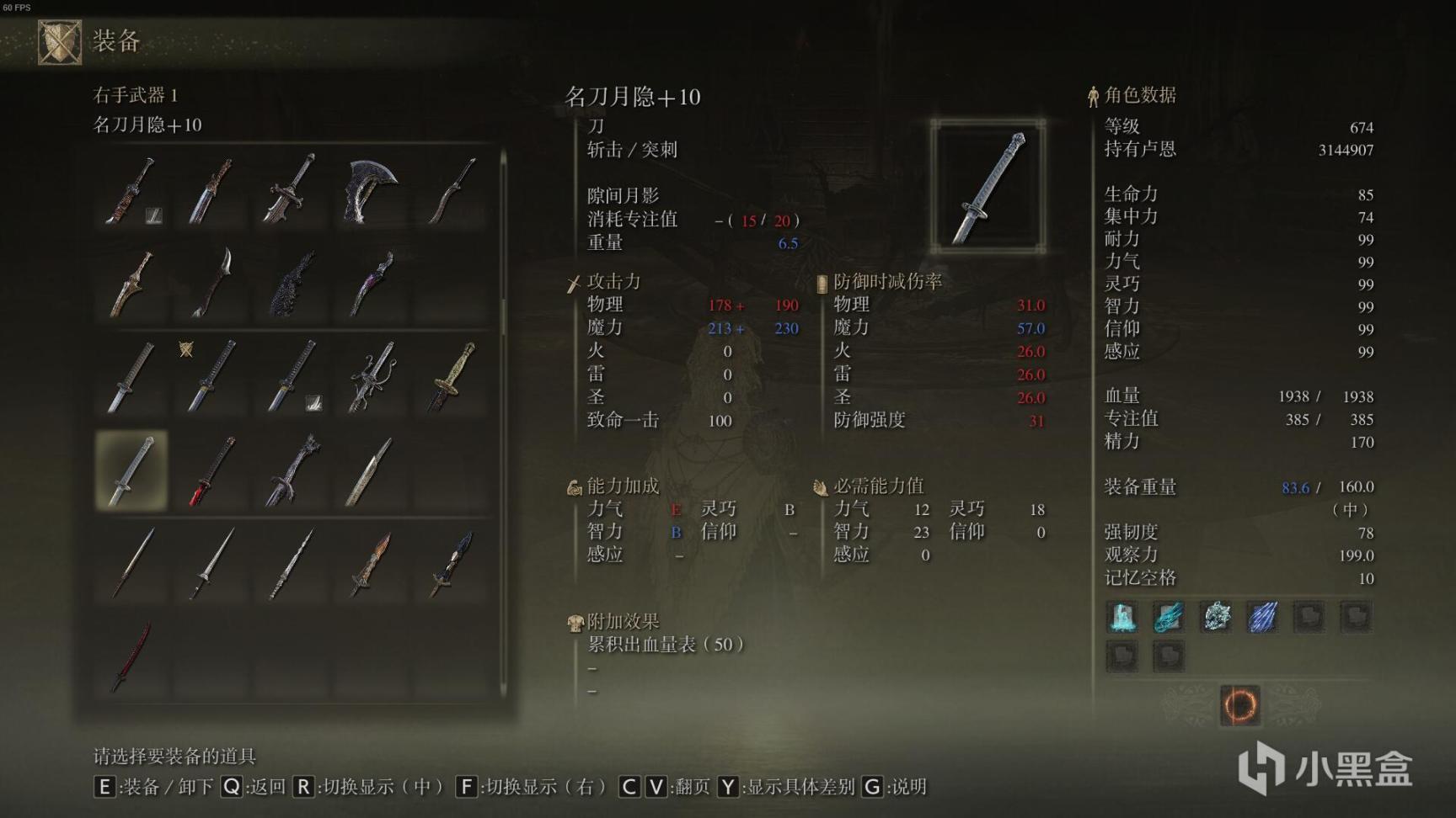 万众瞩目的名刀它来啦。五星肯定是有的,但我们得明白优秀在哪。加点上更偏向灵巧智力两点,需要的点数并不是很多,因此为法师常备刀,面板算优秀但并不是那么出众。但是强就强在名刀的战技,战技居合轻击和重击都是附带剑波,剑和剑波都是具有伤害的,伤害爆炸且居合重击削韧值奇高。而且名刀也有着大多数刀自带的少量出血值。优秀在战技,优秀在战技的伤害和重击奇高的削韧,且前期后期很少萎靡期,法师必备武器之一,很推荐