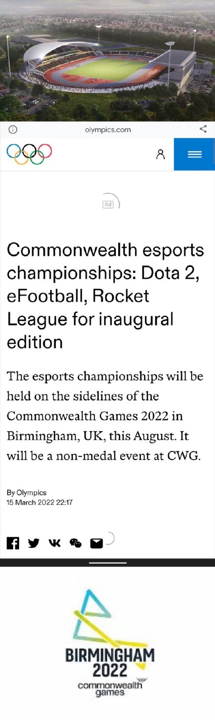 奥林匹克官网消息——全球电子竞技联合会和英联邦运动会3月17日联合宣布,Dota2、火箭联盟,eFootball三款游戏入选首届英联邦电子竞技锦标赛,将于8月6日至7日在英国伯明翰举行。