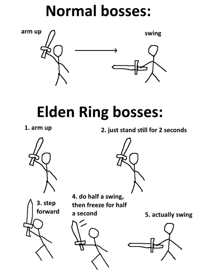 reddit用户WeeziMonkey用一张图直观展示延迟攻击。WeeziMonkey表示,当普通Boss举起他们的手臂时,攻击随之而来,玩家会条件反射地进行招架或者闪避。但《艾尔登法环》中的Boss举起手臂时,并没有直接攻击,而是等玩家翻滚完了再一刀砍向玩家。