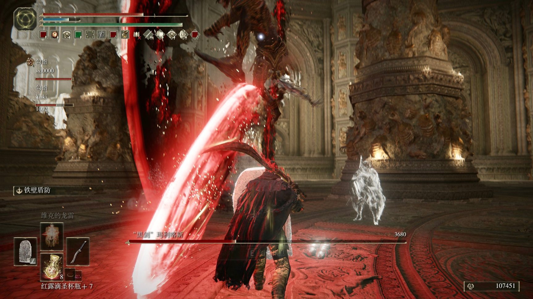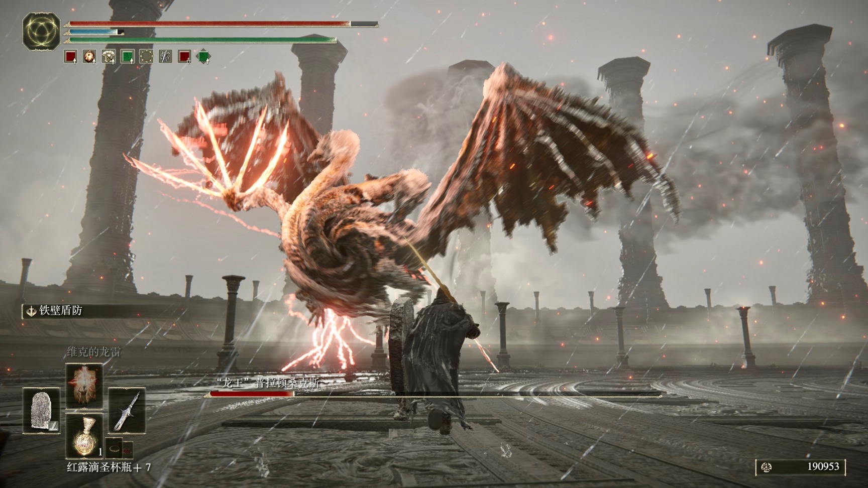 在最后,我不得不为最沉重的大盾附上铁壁盾防,与拉塔恩的战斗,我有太多攻击没信心翻过躲避,而且我是主耐力的加点逻辑,对于有些攻击,立定硬抗收益才最高,但将军的攻击势大力沉,不自知倦,有些攻击即使接下,也会被强制击退而步履踉跄,且就算有大盾护体,将军的大量横扫技能依然难以抵挡。