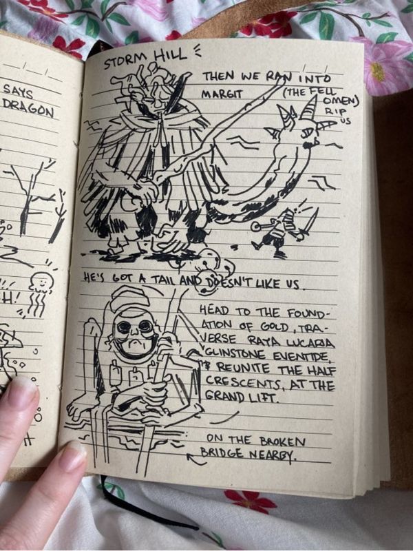 而网友Katie Longua详细记录了有关《艾尔登法环》的剧情,甚至用游戏的图样制作了质感十足的褐色外皮书。
