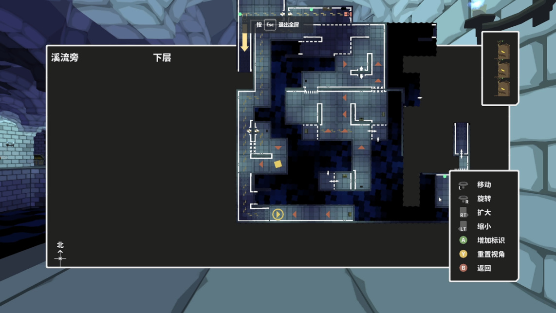 由于本作并不会提供小地图,所以玩家还需在一个区域探索时,不断记忆周围机关或是其他标志物的位置。并且本作中,在地图上用特殊记号所标记的位置,是不会在以第一人称视角的画面中有所体现的。这些特点十分切合这类迷宫探索游戏,但同时的确难倒了像我这样不喜欢看地图的玩家。