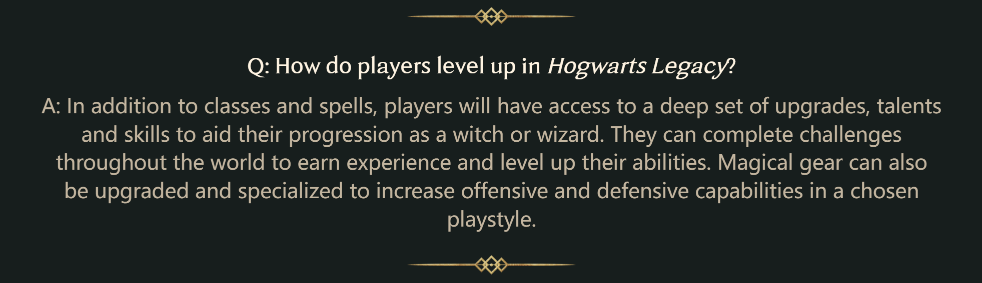 回答:除了课业及咒语之外,玩家还可使用一系列的深入升级、天赋和技能,以在其成为女巫或巫师的过程中予以协助。玩家可以完成世界各处的挑战来获得经验并提升技能。魔法装备也可以强化并专门化,以提升所选游戏风格的进攻和防御能力。